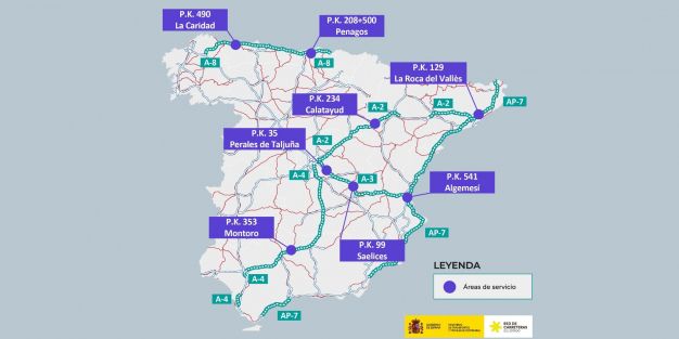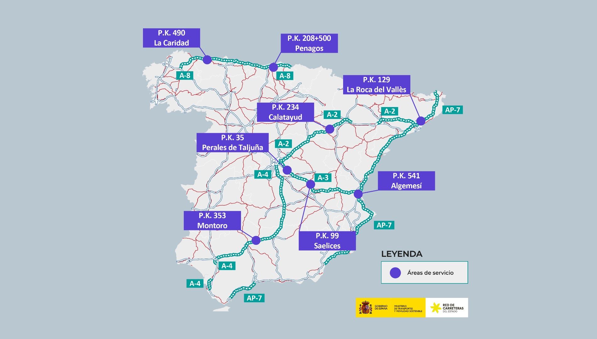 De manera particular, se ha previsto la construcción de ocho áreas de servicio en la red de carreteras del Estado, repartidas en todo el territorio español, como son La Caridad, en Asturias, en la margen derecha del km 490 de la A-8, Penagos, en Cantabria, en ambas márgenes del km 208,5 de la A-8, Calatayud, en la provincia de Zaragoza, en la margen izquierda del km 234 de la A-2, Montoro, en la provincia de Córdoba, en ambas márgenes del km 353 de la A-4, Perales de Tajuña, en la provincia de Madrid, en la margen izquierda del km 35 de la A-3, Saelices, en la provincia de Cuenca, en ambas márgenes del km 99 de la A-3, Algemesí, en la provincia de Valencia, en ambas márgenes del km 541 de la AP-7 y La Roca del Vallés, en la provincia de Barcelona, en ambas márgenes del km 129 de la AP-7.