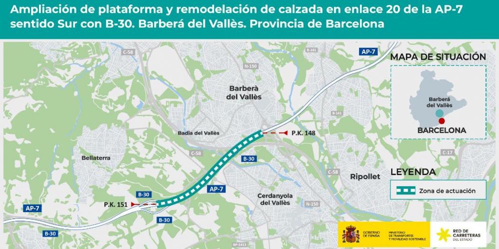 El Ministerio de Transportes y Movilidad Sostenible ha licitado por 600.138 euros el contrato de obras para ampliar la plataforma y la remodelación de la calzada de la AP-7 a su paso por el término municipal de la localidad barcelonesa de Barberà del Vallés.