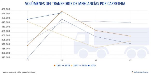 Entre abril y junio de 2025, en España se han movido por carretera un total de 427.221.570 toneladas de mercancías, registro que supone un incremento de un 2,57% con respecto al mismo período de 2024.