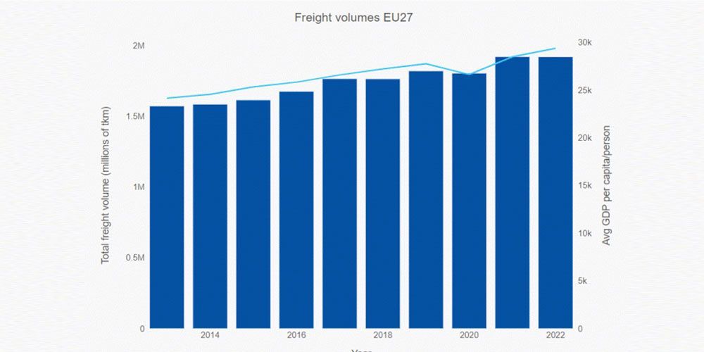 Según este documento, los volúmenes de mercancías movidas por carretera en la Unión Europea han crecido un 22% entre 2013 y 2022, con una tendencia al alza sostenida a lo largo de toda esa década, salvo durante el lapso que supuso 2020 a causa de la pandemia de la covid.