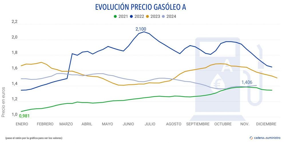 El precio del gasóleo se ha situado en los 1,406 euros de media en España en la semana del 12 al 18 de noviembre de 2024, lo que marca un ascenso del 0,5% respecto a los 1,399 de la semana anterior, según recoge el último Boletín Petrolero de la Unión Europea.
