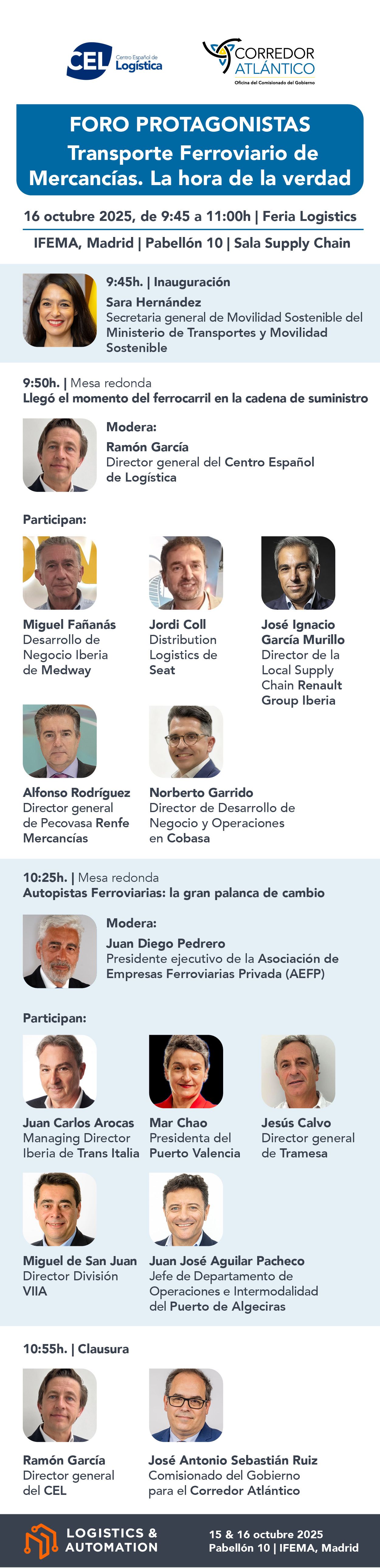 En un momento en el que la descarbonización, la eficiencia energética y la competitividad marcan la agenda del transporte, el Centro Español de Logística y la Oficina del Comisionado del Corredor Atlántico han convocado el Foro Protagonistas del Ferrocarril, que tendrá lugar el 16 de octubre en el marco de la feria Logistics & Automation.