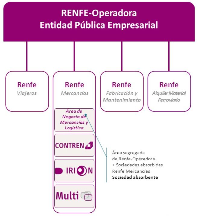 Además la fusión por absorción entre Renfe Mercancías, como sociedad absorbente, e Irion, Contren y Multi, como sociedades absorbidas que hasta ahora desarrollaban su actividad en función de los distintos mercados propios del sector logístico y la constitución de Renfe Alquiler de Material Ferroviario, como sociedad de nueva creación.