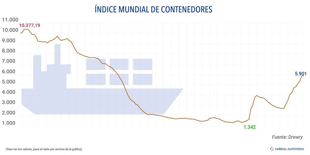 El Índice Mundial de Contenedores elaborado por Drewry, que evalúa las tasas de carga de contenedores en las ocho rutas principales hacia y desde Estados Unidos, Europa y Asia, se ha incrementado en un 1% en la última semana, llegando hasta los 5.901 dólares/FEU (5.411 euros).