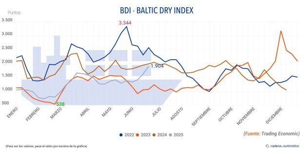 El Baltic Dry Index, que refleja los precios de los fletes de buques graneleros tomando como referencia 23 rutas marítimas, ha registrado un ascenso de 166 puntos o un 9,6% en la jornada del viernes 13 de junio, llegando hasta los 1.904 puntos. Esto supone también un aumento del 16,59% durante la última semana, llegando a su punto máximo desde octubre.