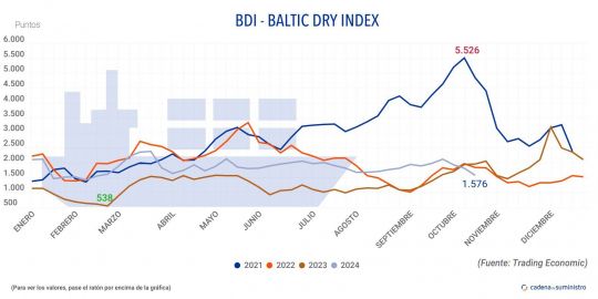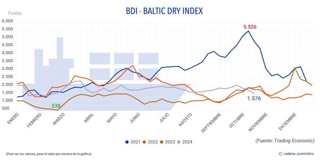 En concreto, el segmento 'capesize', referido a buques que transportan hasta 150.000 toneladas de mercancía, como hierro o carbón, ha perdido 46 puntos en la última jornada, llegando hasta los 2.276, mientras que a nivel semanal ha retrocedido más de un 18%.