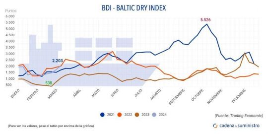 El Baltic Dry Index, BDI, que refleja los precios de los fletes de buques graneleros tomando como referencia 23 rutas marítimas, ha anotado un incremento de 92 puntos o un 4,4% en la jornada del viernes 1 de marzo, hasta los 2.203 puntos. Esto supone un ascenso del 18% a nivel semanal.