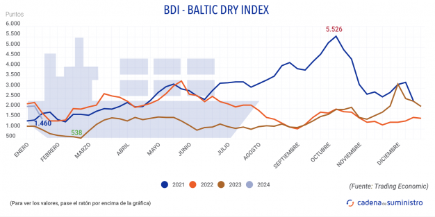 El Baltic Dry Index, BDI, que refleja los precios de los fletes de buques graneleros tomando como referencia 23 rutas marítimas, ha anotado un descenso de 94 puntos o un 6,1% en la jornada del viernes 12 de enero, hasta los 1.460 puntos. Esto supone una caída superior al 30% a nivel semanal, la mayor desde el año 2008.