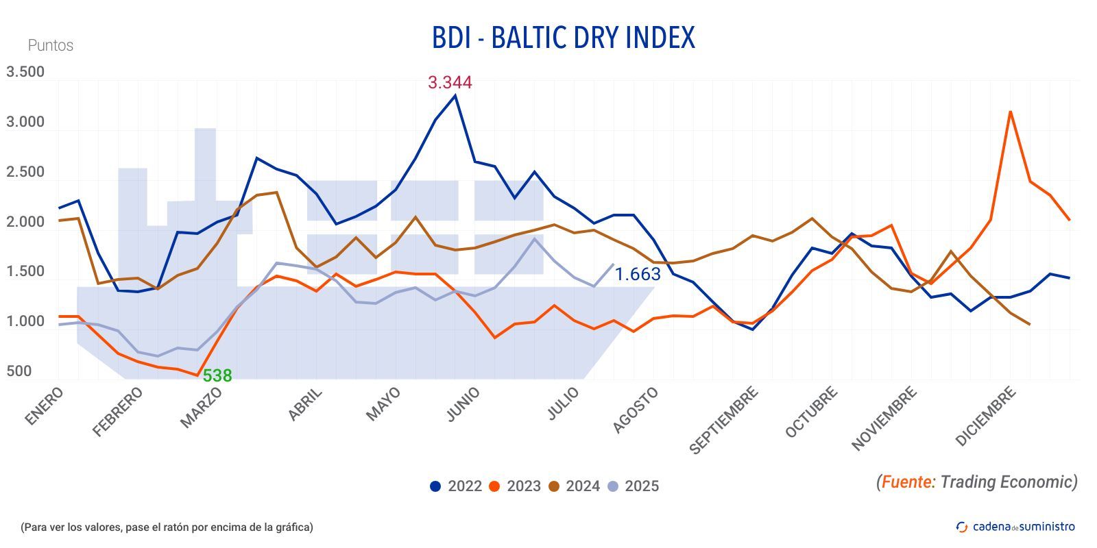 El Baltic Dry Index, que refleja los precios de los fletes de buques graneleros tomando como referencia 23 rutas marítimas, ha registrado un incremento de 198 puntos o un 13,5% en la jornada del viernes 11 de julio, llegando hasta los 1.663 puntos. Esto supone un aumento del 2% durante la última semana.