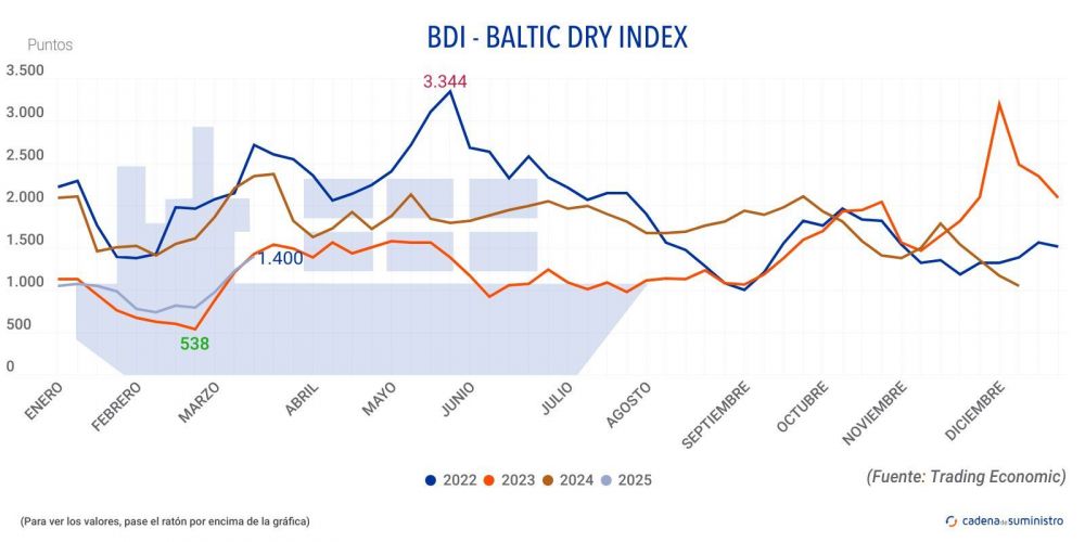 El Baltic Dry Index, BDI, que refleja los precios de los fletes de buques graneleros tomando como referencia 23 rutas marítimas, ha registrado un aumento de 114 puntos en la jornada del viernes 7 de marzo, llegando hasta los 1400 puntos. Esto supone, además, un incremento total de más del 4% durante la última semana.