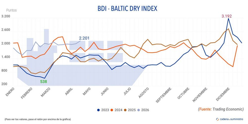 El Baltic Dry Index, que refleja los precios de los fletes de buques graneleros tomando como referencia 23 rutas marítimas, se ha incrementado en un 1,9% en la jornada del viernes 10 de abril de 2026, llegando hasta los 2.201 puntos. A nivel semanal, asimismo, se ha producido un ascenso de un 6,5%.
