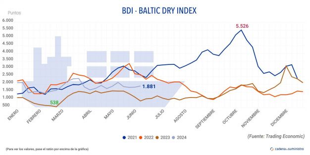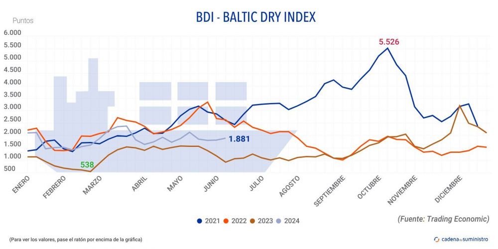 El Baltic Dry Index, BDI, que refleja los precios de los fletes de buques graneleros tomando como referencia 23 rutas marítimas, ha registrado un aumento de 12 puntos o un 0,64% en la jornada del viernes 7 de junio, hasta los 1.881 puntos. Esto supone un incremento del 3,64% a nivel semanal.