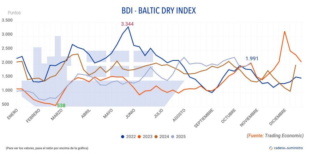 El Baltic Dry Index, que refleja los precios de los fletes de buques graneleros tomando como referencia 23 rutas marítimas, se ha reducido un 3,2% en la jornada del viernes 24 de octubre, llegando hasta los 1.991 puntos. Esta cifra supone, además, un descenso del 3,76% en el transcurso de la última semana.