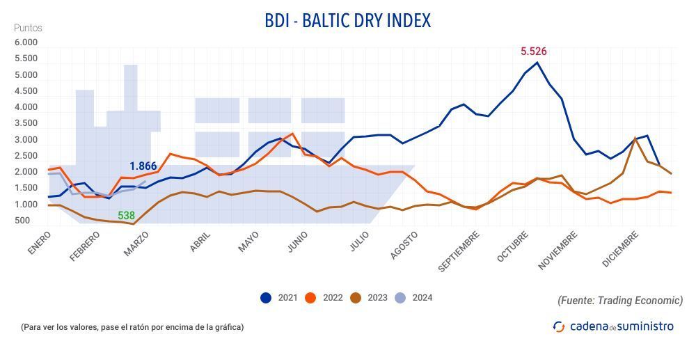 El Baltic Dry Index, BDI, que refleja los precios de los fletes de buques graneleros tomando como referencia 23 rutas marítimas, ha anotado un incremento de 114 puntos o un 6,5% en la jornada del viernes 23 de febrero, hasta los 1.866 puntos. Esto supone un ascenso del 16% a nivel semanal.