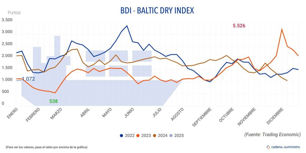 El Baltic Dry Index, BDI, que refleja los precios de los fletes de buques graneleros tomando como referencia 23 rutas marítimas, ha registrado un incremento de 43 puntos en la jornada del viernes 3 de enero, hasta los 1.072 puntos.