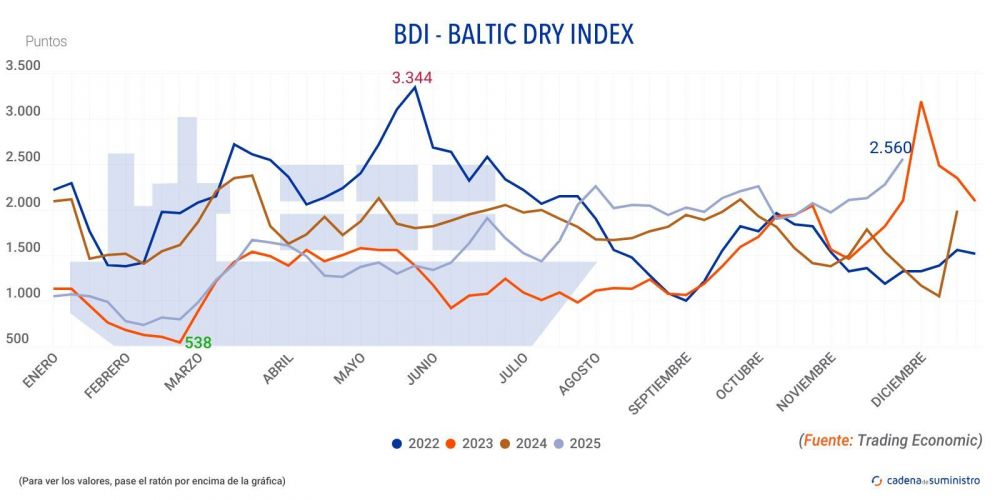 El Baltic Dry Index, que refleja los precios de los fletes de buques graneleros tomando como referencia 23 rutas marítimas, se ha incrementado en 80 puntos o un 3,2% en la jornada del viernes 28 de noviembre, llegando hasta los 2.560 puntos. Esta cifra supone, además, un aumento del 12,5% en el transcurso de la última semana y la cifra más alta desde diciembre de 2023.