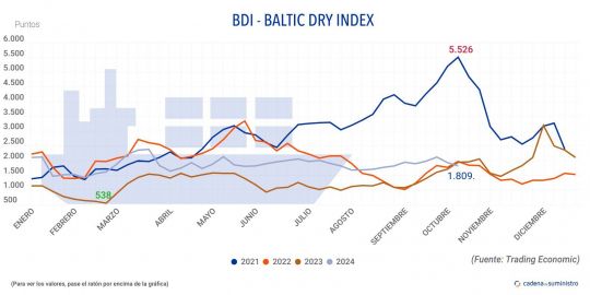 En concreto, el segmento 'capesize', referido a buques que transportan hasta 150.000 toneladas de mercancía, como hierro o carbón, ha ganado 80 puntos en la última jornada, llegando hasta los 2.835, pero a nivel semanal ha retrocedido más de un 15%.
