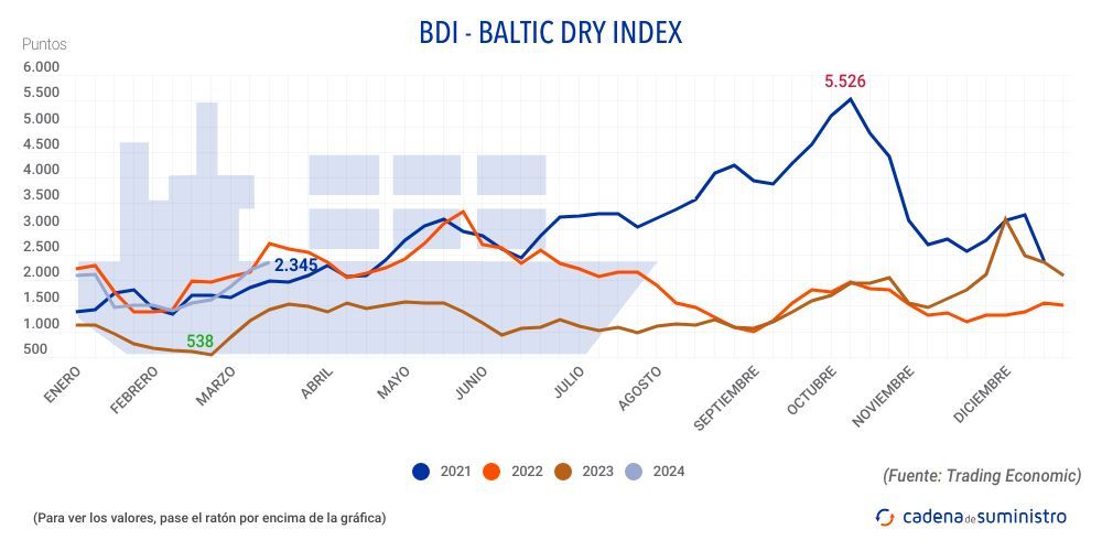 El Baltic Dry Index, BDI, que refleja los precios de los fletes de buques graneleros tomando como referencia 23 rutas marítimas, ha anotado un incremento de 94 puntos o un 4,2% en la jornada del viernes 8 de marzo, hasta los 2.345 puntos. Esto supone un ascenso del 6,4% a nivel semanal.