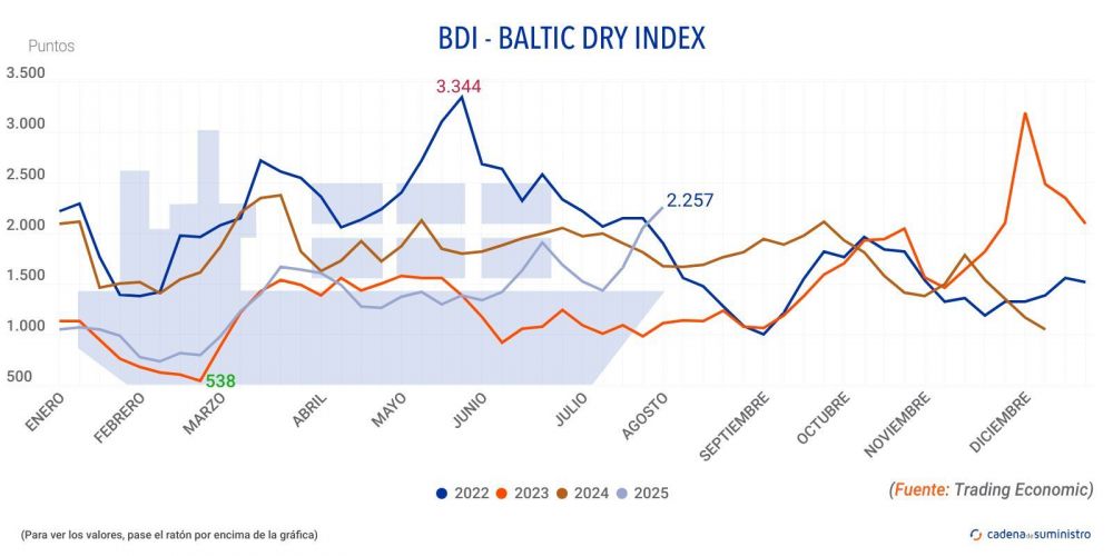 El Baltic Dry Index, que refleja los precios de los fletes de buques graneleros tomando como referencia 23 rutas marítimas, ha registrado un pequeño descenso de un punto o un 0,4% en la jornada del viernes 25 de julio, llegando hasta los 2.257 puntos. Esto supone, no obstante, un aumento del 10% durante la última semana.