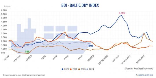 El Baltic Dry Index, BDI, que refleja los precios de los fletes de buques graneleros tomando como referencia 23 rutas marítimas, ha registrado una caída de 26 puntos o un 1,4% en la jornada del viernes 26 de julio, hasta los 1.808 puntos. Esto supone un descenso del 3,6% durante la semana.