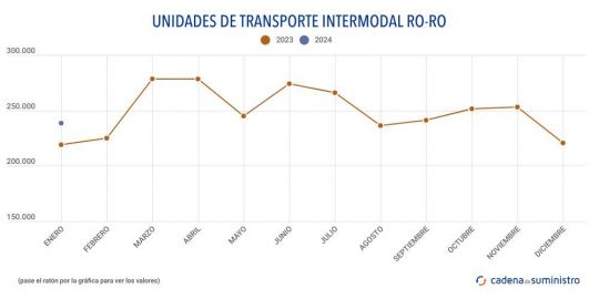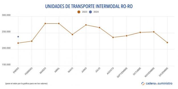 De igual modo, en el mes se han registrado un total de 238.672 unidades de transporte intermodal ro-ro, un 8,9% más que en idéntico período de un año antes.