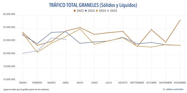 En los cuatro primeros meses de 2025, el tráfico total de graneles líquidos suma 58.776.926 toneladas, un 3,7% anual menos, mientras que el de graneles sólidos alcanza las 26.948.060 toneladas, un 1,3% menos que hace un año.