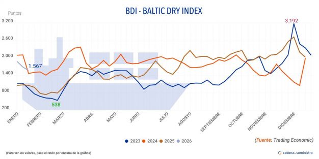 El Baltic Dry Index, que refleja los precios de los fletes de buques graneleros tomando como referencia 23 rutas marítimas, se ha incrementado en 35 puntos o un 2,3% en la jornada del viernes 16 de enero, llegando hasta los 1.567 puntos. Esta cifra supone, por otro lado, una caída del 7,2% en el transcurso de la última semana.