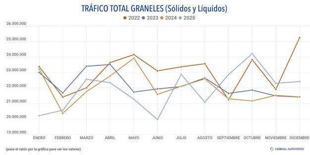 En todo 2025, el tráfico total de graneles líquidos suma 180.435.794 toneladas, un 0,9% anual más, mientras que el de graneles sólidos alcanza las 81.874.481toneladas, un 3,4% menos que hace un año.