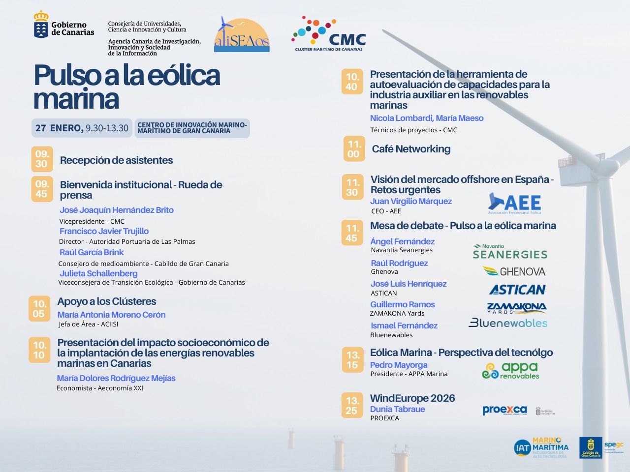 El programa incluye una bienvenida institucional a cargo de representantes del CMC, la Autoridad Portuaria de Las Palmas, el Cabildo de Gran Canaria y el Gobierno de Canarias. Además, en el marco del proyecto aliSEAos, la economista María Dolores Rodríguez, de Aeconomía XXI, dará a conocer el impacto socioeconómico de las energías renovables marinas en Canarias y se presentará una herramienta de autoevaluación de capacidades dirigida a la industria auxiliar del sector.