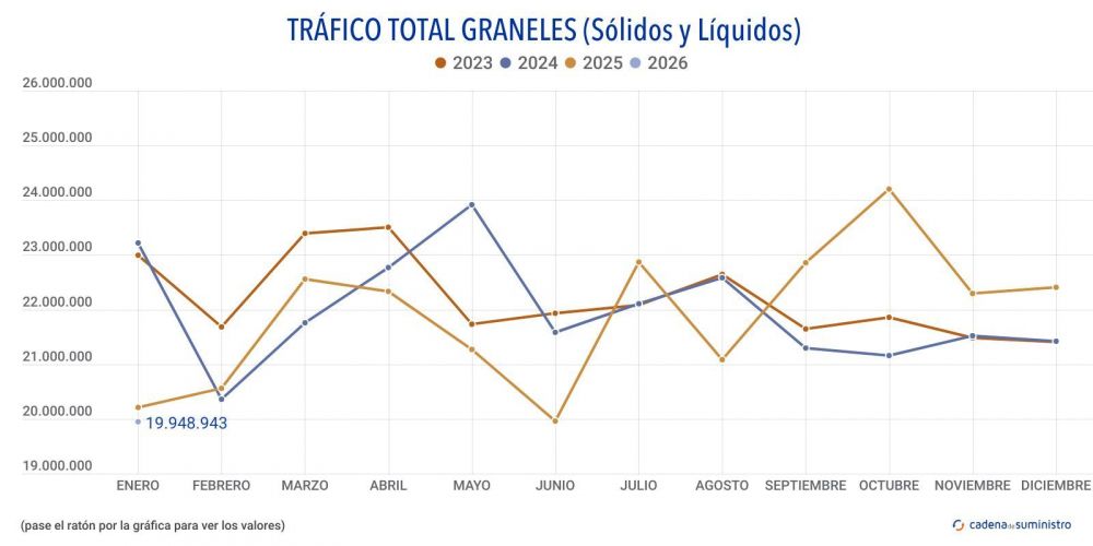 Justo por detrás, el movimiento de graneles líquidos en el puerto de Huelva suma un total de 1.967.652 toneladas, con un ascenso de un 6,4% con respecto a enero de 2025.