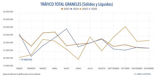 Durante el pasado mes de enero, los puertos españoles han movido 13.699.878 toneladas de graneles líquidos, un 2,4% menos que hace un año, y 6.249.652 toneladas de graneles sólidos, un 1,4% anual más.