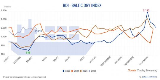 El Baltic Dry Index, que refleja los precios de los fletes de buques graneleros tomando como referencia 23 rutas marítimas, se ha reducido en un 6% en la jornada del viernes 6 de marzo de 2026, llegando hasta los 2.010 puntos.