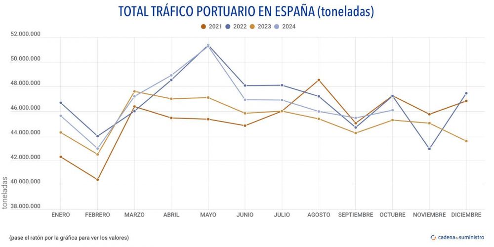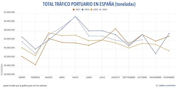 Además, el sistema portuario también registra un tráfico de mercancía general de 23.627.686 toneladas en el mes, con un ascenso con respecto a hace un año de un 6,44%.