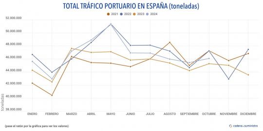 El tráfico acumulado en los diez primeros meses del ejercicio también presenta un incremento anual de un 3% para un volumen total en el período de 468.399.486 toneladas.