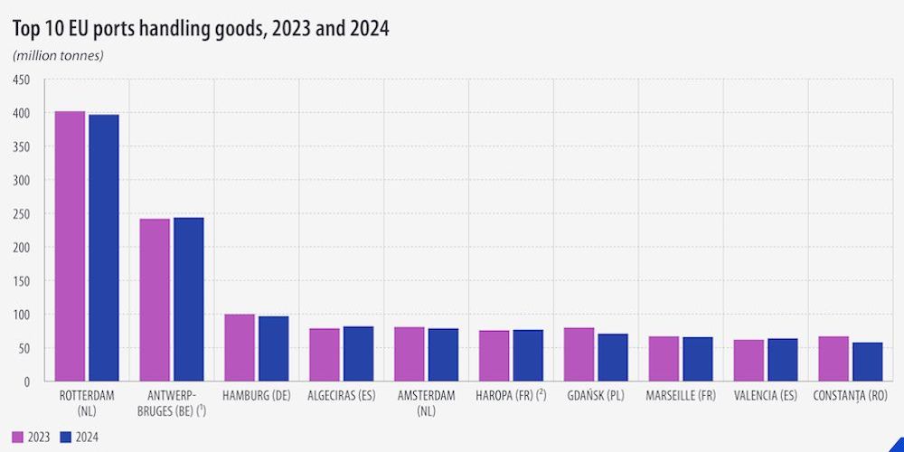 Eurostat calcula que los puertos europeos han movido unos 3.400 millones de toneladas de mercancías el pasado 2024, un volumen similar al registrado un año antes.