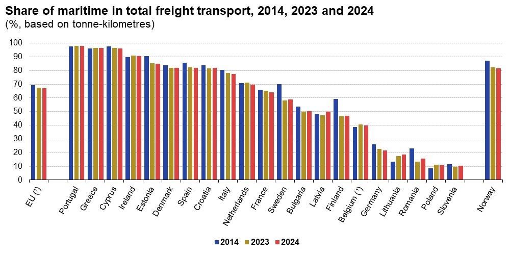 Por países, Eurostat constata que la cuota del transporte marítimo en el total del transporte de mercancías se ha mantenido relativamente estable en la mayoría de todos ellos países.