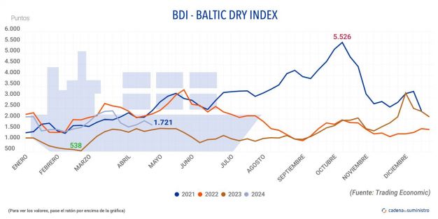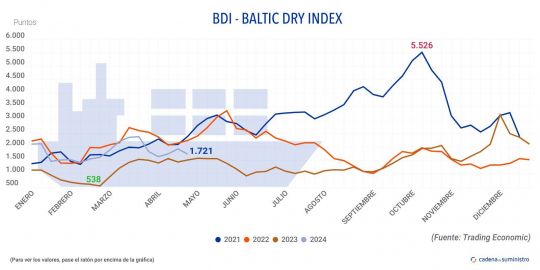 En concreto, el segmento 'capesize', referido a buques que transportan hasta 150.000 toneladas de mercancía, como hierro o carbón, ha perdido 58 puntos o un 2,6%, hasta alcanzar los 2.172, mientras que en términos semanales, se ha registrado una caída de más de un 23%.