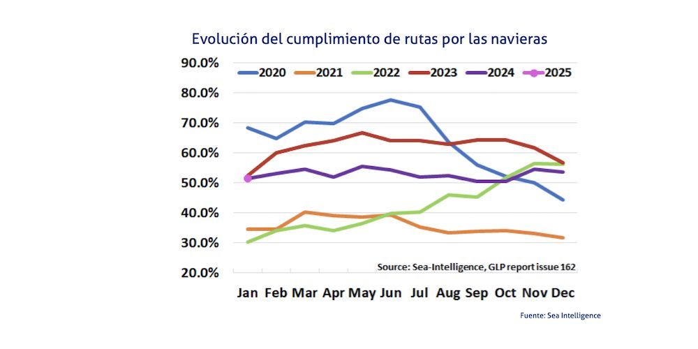 En este sentido, el último análisis de Sea Intelligence apunta que la fiabilidad de las rutas marítimas ha disminuido durante el primer mes de este año pasado en 2,1 puntos porcentuales para colocarse en un 51,5%, exactamente el mismo registro que tenía en enero de 2024.