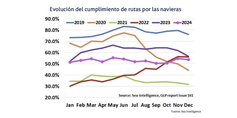 El grado de cumplimiento de los tiempos de tránsito queda a final del año pasado entre un 45% y un 50% para las trece principales navieras.