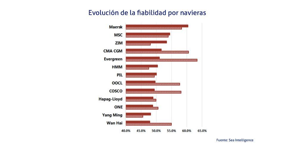 Por navieras, la más fiable es, según el análisis de Sea Intelligence, Maersk, con un 60,4%. Por detrás de la danesa se colocan otras seis compañías con porcentajes de fiabilidad de entre un 50% y un 60%, mientras que la media docena restante del análisis tiene indicadores de fiabilidad entre un 47% y un 50%.