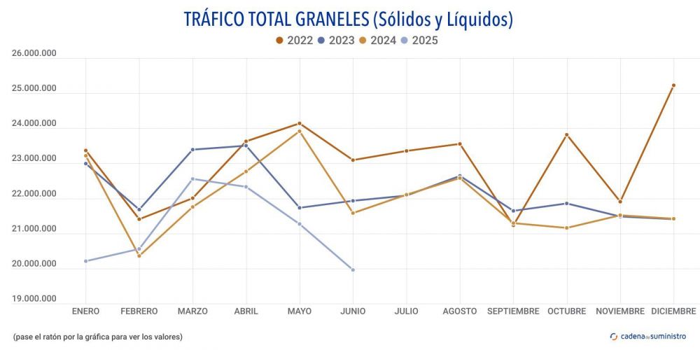 En los seis primeros meses de 2025, el tráfico total de graneles líquidos suma 87.036.284 toneladas, un 5,5% anual menos, mientras que el de graneles sólidos alcanza las 39.951.997 toneladas, un 4,7% menos que hace un año.