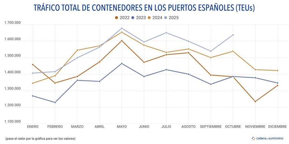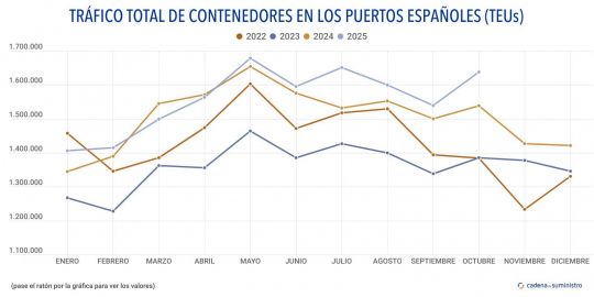 Durante el pasado mes de octubre, el sistema portuario español ha movido 1.637.457 TEUs, un 5,58% más que en el décimo mes del pasado 2024.