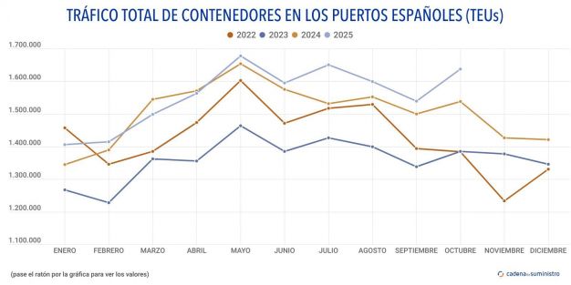 En detalle, 810.209 TEUs corresponden a contenedores en tránsito, un 1,36% anual menos, mientras que 195.278 TEUs corresponden a entradas y salidas nacionales, un 9,11% más que en octubre de 2024, y 631.970 TEUs a import-export exterior, lo que se traduce en un ascenso anual de un 14,77%.