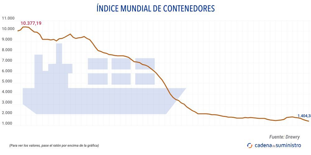 El Índice Mundial de Contenedores elaborado por Drewry, que evalúa las tasas de carga de contenedores en las ocho rutas principales hacia y desde Estados Unidos, Europa y Asia, se ha reducido en un 5,1% hasta los 1.404,38 dólares/FEU (1325,28 euros).