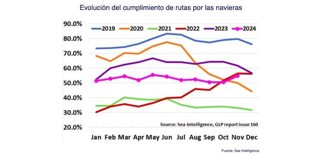 En este sentido, el último análisis de Sea Intelligence apunta que la fiabilidad de las rutas marítimas ha crecido durante el mes 4,1 puntos porcentuales para colocarse en un 54,8%, frente al 51,5% de octubre.
