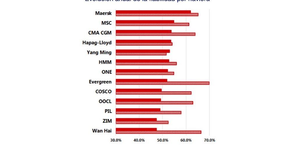 Por navieras, la más fiable es, según el análisis de Sea Intelligence, Maersk, con un 61,9%. Por detrás de la danesa se colocan otras ocho compañías con porcentajes de fiabilidad de entre un 50% y un 60%.