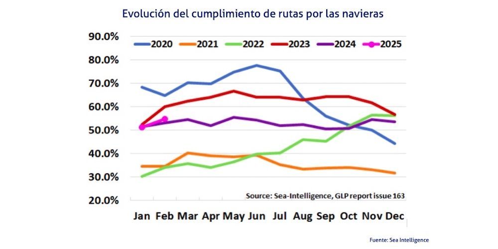 En este sentido, el último análisis de Sea Intelligence apunta que la fiabilidad de las rutas marítimas ha aumentado durante el segundo mes de este año pasado en 3,6 puntos porcentuales para colocarse en un 54,9%, el registro más alto desde mayo de 2024.