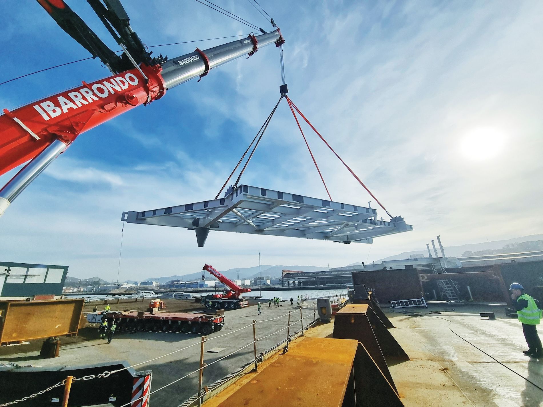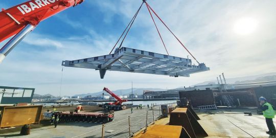 En la operativa, desarrollada en el nuevo muelle de Udondo de Navacel ha participado el remolcador Centaurus, de la empresa Marlow Navigation, que se encargó del transporte de la gabarra hasta Dinamarca. Una vez ensambladas las piezas serán enviadas a Estados Unidos junto a material procedente de Sevilla y Polonia.