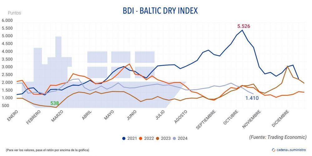 El Baltic Dry Index, BDI, que refleja los precios de los fletes de buques graneleros tomando como referencia 23 rutas marítimas, ha registrado una caída de siete puntos o un 0,5% en la jornada del viernes 25 de octubre, hasta los 1.410 puntos. Esto, no obstante, supone un descenso del 10,53% durante la semana.
