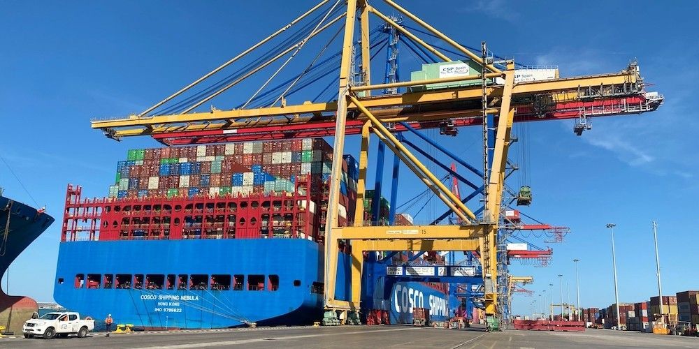 Los contenedores se descargan de un buque de Cosco, se transportan en camión, se descargan, pasan el despacho de aduanas y se transportan al Aeropuerto Internacional de Atenas, donde Goldair gestiona la descarga, el control y el almacenamiento en sus instalaciones hasta que llega el momento de volar.